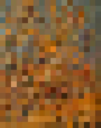 Этюд. Вид с возвышенности. На переднем плане изображен пожилой мужчина, опирающийся на палочку; он стоит посреди деревенской улицы. На втором плане - покосившиеся заборчики, за ними - деревья в яркой осенней листве. На дальнем плане, на фоне ярко-голубого неба видна крыша дома. Пастозная живопись.