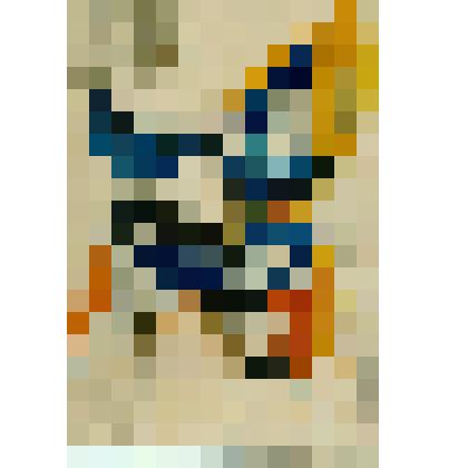 Мужская фигура стоя в рост, в профиль влево. В костюме в виде шара. Верхняя часть лиловая с оранжевой вставкой -мундир, нижняя белая-брюки. На животе и спине оранжевые помпоны. На голове седой парик с вихрами, бутафорский красный нос.