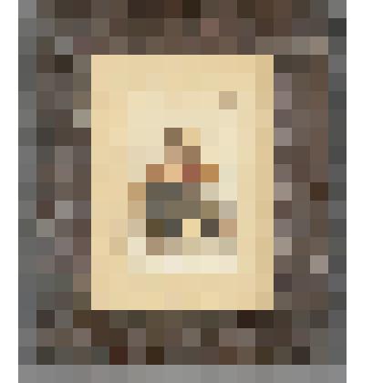Изображение погрудное, голова и фигура даны в профиль, с правой стороны. На голове парик с косичкой, грудь украшена жабо. Черный силуэт дан на желтом фоне, в окружении рамочки растительного орнамента. На обороте в центре монограмма желтого металла, вокруг которой расположена косичка из русых волос, фоном им служит ярко синий полупрозрачный материал.