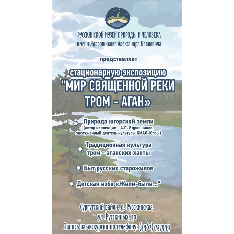 В стационарной экспозиции «Мир священной реки Тром-Аган» соседствуют природа югорской земли и традиционная культура коренных народов – тром-аганских ханты. Экспозиция призвана не только проникнуть в сокровенные сюжеты хантыйского мироздания, но и раскрыть природное многообразие края посредством уникальной таксидермической коллекции А. П. Ядрошникова. Значительное место в экспозиции отведено и русскому старожильческому населению Западной Сибири. Музейный фонд насчитывает более 6 000 экспонатов в 12-ти коллекциях.