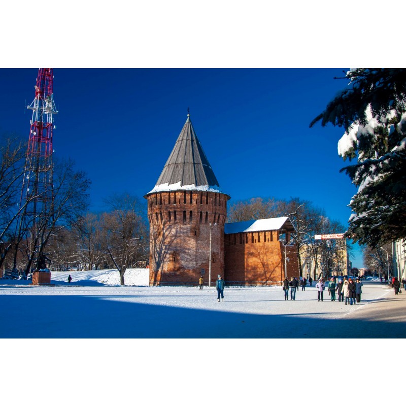 Смоленская крепость – памятник российского оборонительного зодчества, крупнейшая сохранившаяся кирпичная крепость мира, символ российской истории и государственности. Крепостная стена, возведенная на рубеже XVI–XVII веков, имела протяженность более 6,5 км и 38 башен. К настоящему времени сохранилось 14 оригинальных башен и 4 перестроенные. Протяженность сохранившихся прясел – около 3 км, они охватывают центральную часть Смоленска.