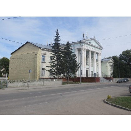 Двухсветный зал заседаний на 260 мест имеет естественное освещение из окон, расположенных по продольным стенам. Вдоль каждой наружной стены, с отступом, располагается колоннада в пять пролетов. Между колоннами устроены 3 яруса полукруглых в плане лож, поднимающихся уступами к уровню балкона, устроенного в уровне второго света, напротив портала сцены. Низ лож и балкона украшен широким штукатурным поясом тянутой формы. Портал сцены по ширине равен половине среднего пролета зала, его фланкируют парные пилястры с композитными капителями, сочетающими волюты, пальметты и пятиконечные звезды. Аналогичными капителями оформлены все колонны зала, имеющие квадратное сечение со срезанными углами, а также пилястры. По сторонам от портала размещены декоративные ниши, оформленные рамочными наличниками и прямыми сандриками. Парадный выход из зала расположенный по центральной оси украшен прямым массивным сандриком на волютообразных консолях. Потолок зала по периметру оформлен фризом и массивным карнизом с лепными модульонами и зубчиками, а также другими лепными элементами. По центру зала располагается массивная многорожковая люстра из желтого металла с шарообразными плафонами. Аналогичного вида шары - над ложами и балконом, а также двухрожковые бра расположены на колоннах.Обеденный зал столовой имеет колонны крестообразного сечения и пилястры со стилизованными капителями, штукатурные карнизы тянутой формы устроенные по периметру потолков и балок перекрытия, лепные плафоны у осветительных приборов, лепные плакетки с изображением снопов по стенам.6.Благоустройство: открытая площадь перед центральным портиком, сквер вдоль юго-западного фасада здания.