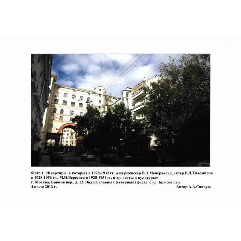 - Адрес: г.Москва, Брюсов пер., д.12 (ул. Неждановой, д. 12, кв.11 - Мейерхольд В.Э., кв.14 - Гиацинтова С.В., Бересенев И.Н., кв.16 - Семенова М.Т., кв. 17 - Попова В.Н., Кторов А.П., кв. 9 - Н.И. Рерберг, кв. 5 - В.Д. Тихомиров, кв. 8 - В.В. Кригер)