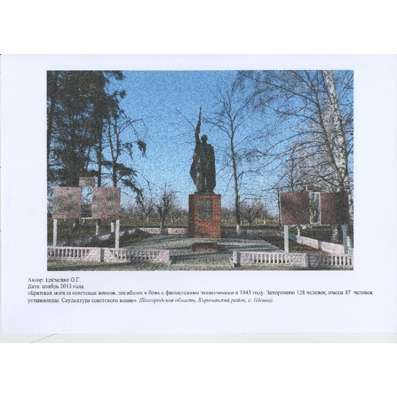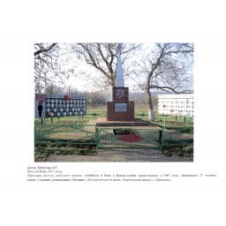 Братская могила советских воинов, погибших в боях с фашистскими захватчиками в 1943 году. Захоронено 117 человек, имена 50 человек установлены. Обелиск. Скульптура советского воина.