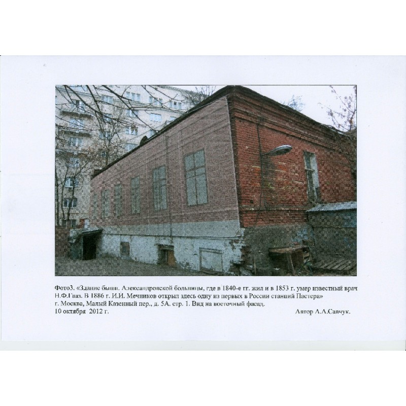 Здание бывшей Александровской больницы, где в 1840-х гг. жил и в 1853 г. умер известный врач Н.Ф.Гааз. В 1886 г. И.И.Мечников открыл здесь одну из первых в России станций Пастера