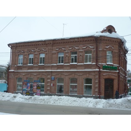 Дом двухэтажный каменно-деревянный, завершен вальмовой кровлей. Первый этаж кирпичный, второй бревенчатый.