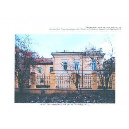 Композиция и архитектурно-художественное оформление фасадов: общее декоративно-композиционное решение фасадов, включая цокольную часть, широкие лопатки, профилированный межэтажный пояс на главном фасаде, подоконные полочки, балкон на фигурных кованых кронштейнах с металлическим фигурным ограждением на главном фасаде, фриз с сухариками, карниз, парапетные тумбы, парапетные ограждения и аттиковые стенки, металлический лучковый козырек на фигурных кованных кронштейнах на южном фасад и т.д.