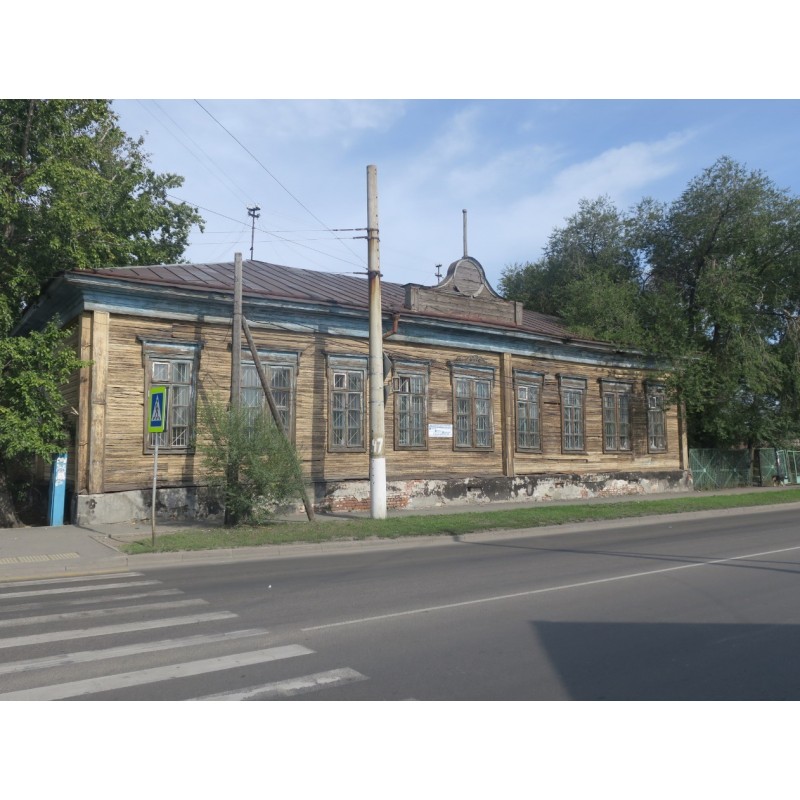 Одноэтажное бревенчатое здание на кирпичном цоколе. Основной объем - прямоугольный в плане вытянут вдоль улицы Челюскинцев имеет вальмовую крышу. По флангам дворового северо-восточного фасада - небольшие бревенчатые прирубы входов в здание, односкатная крыша которых подведена под основной карниз.