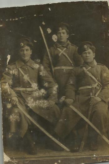 Восточный, северный и западный фасады. 1 этаж. Гладкий широкий, в центре трехчастный элемент, состоящий из трех трапециевидных деталей, имитирующих замковый камень, кирпичные, оштукатуренные. Северный фасад - 6, восточный фасад - 7, западный - 7.