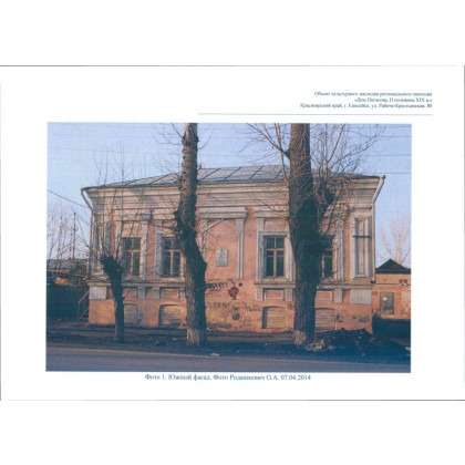 - на дворовом, северо-восточном фасаде осевое расположение проемов с лучковым завершением: широкий дверной проем входа и высокий оконный проем - по оси ризалита, по четыре оси вертикально ориентированных оконных проемов слева и справа от него; невысокие оконные проемы в левой части цоколя;