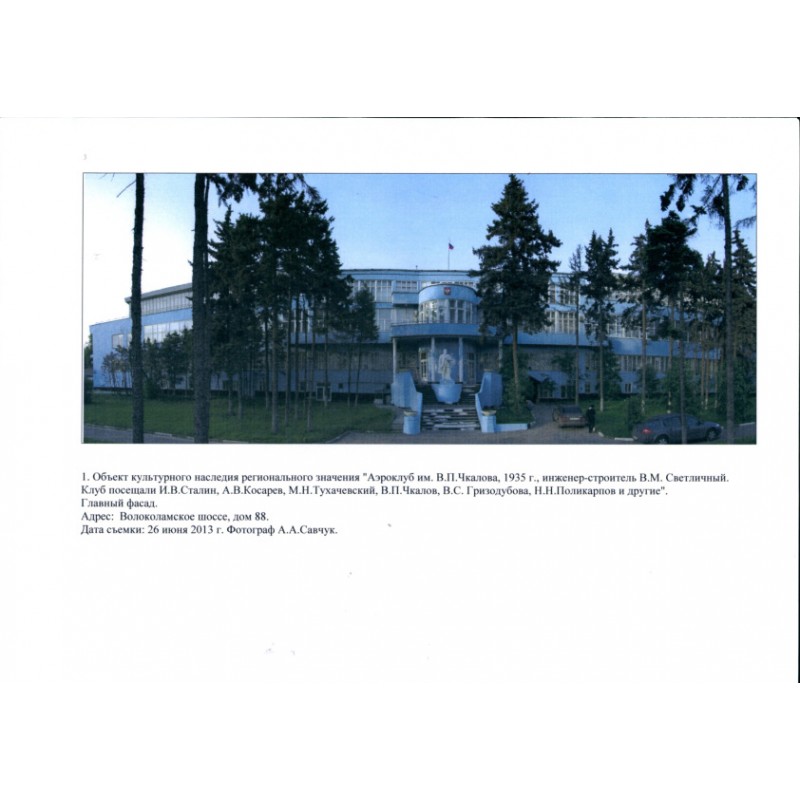 Аэроклуб им. В.П.Чкалова, 1935 г., инженер-строитель В.М.Светличный. Клуб посещали И.В.Сталин, А.В.Косарев, М.Н.Тухачевский, В.П.Чкалов, В.С.Гризодубова, Н.Н.Поликарпов и другие
