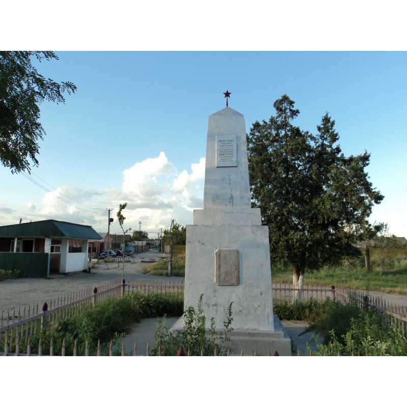 2. Обелиск, сооруженный из кирпича и отделанный штукатуркой. Памятник выполнен в форме многоступенчатой усеченной пирамиды. Обелиск венчает металлическая пятиконечная звезда.