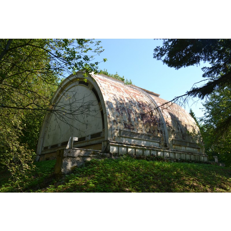 металлический павильон на насыпном холме прямоугольный в плане, полусферической формы с раздвижной металлической конструкцией;