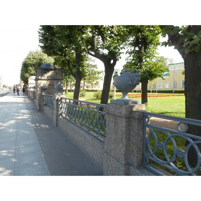 габариты и конфигурация ограды, оформляющей северную границу парадного двора - вдоль Шпалерной улицы.