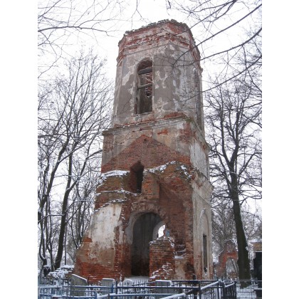 Над колокольней крыша шатровая, над шатром – главка на гранёной шее, в основании которой пояс из восьми небольших шлемовидных закомар. На гранях шатра (через одну) расположены слуховые окна, представляющие собой прямоугольные проёмы с двускатными крышами.