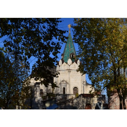 приподнятая на гладком фризе сложных очертаний восьмискатная шлемовидная крыша со шпилем.