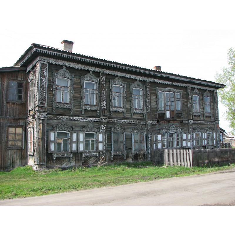 Двухэтажный деревянный дом начала XX века с развитой резьбой наличников и карнизов