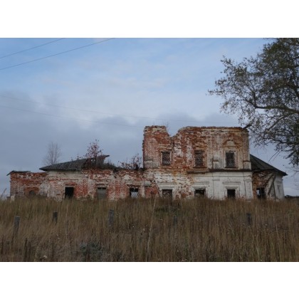 - портик в центре главного юго-восточного фасада: четыре полуколонны со стилизованными капителями и базами, антаблемент и треугольный деревянный фронтон, арочное слуховое окно в тимпане фронтона