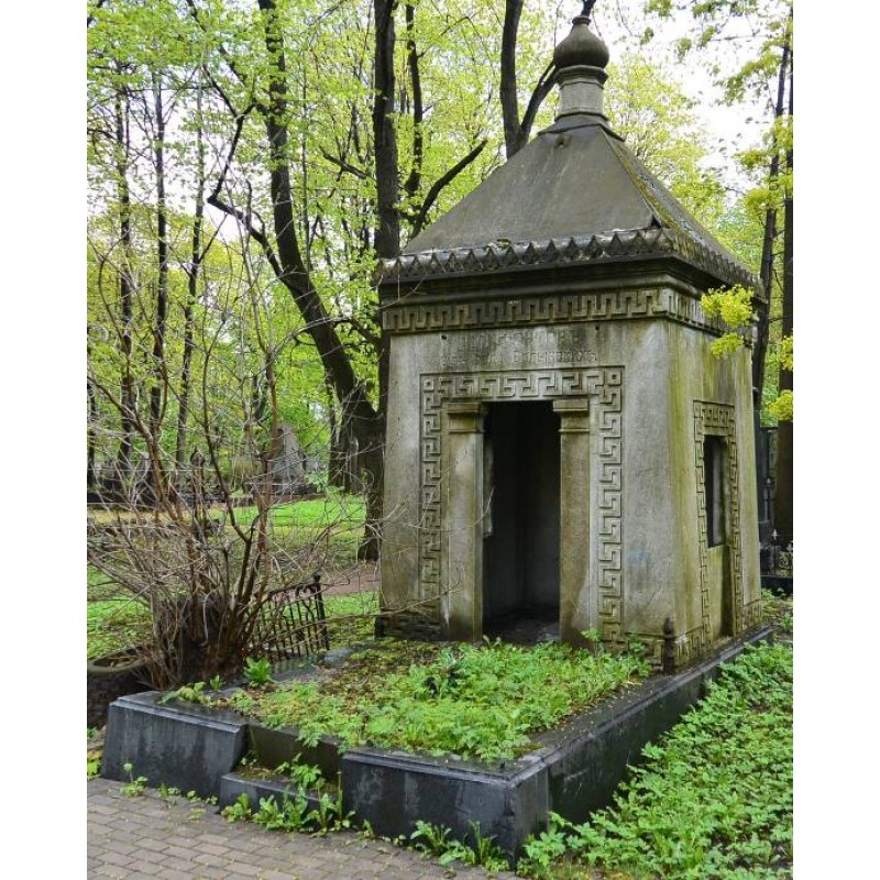 Объемно-пространственное и архитектурно-художественное решение: историческое местоположение захоронения, габариты и конфигурация надгробия (семейное захоронение); историческое архитектурно-художественное решение надгробия в виде прямоугольного в плане склепа-усыпальницы на гранитном подиуме с металлической оградой (утрачена), прямоугольный портал, фланкирован гладкими пилястрами, окна обрамлены рельефными меандрами, венчаюший профилированный карниз декорирован рельефным меандром и зубцами килевидной формы, четырёхскатное окрытие завершено барабаном с луковицей и крестом (утрачен); рельефные символы, характер и содержание надгробных надписей.