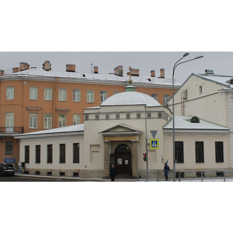 габариты одноэтажного, сложного в плане здания, с повышенным прямоугольным объемом часовни в угловой части, выходящего фасадами на Синопскую набережную и проспект Бакунина;