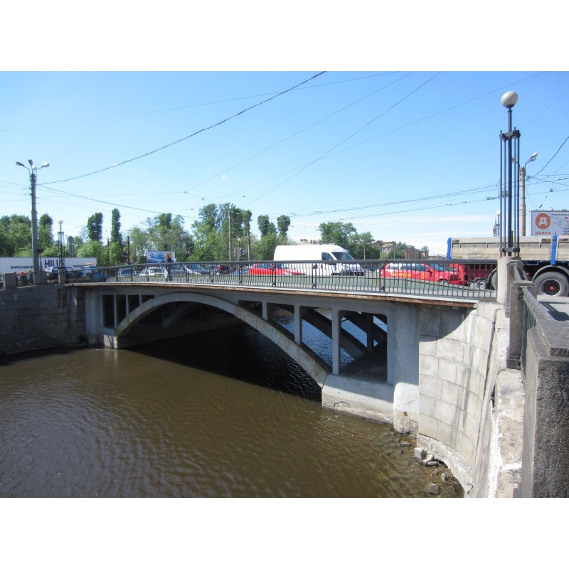 исторические габариты и конфигурация железобетонного арочного однопролетного моста с открылками, включая ограждение и четыре торшера-фонаря.