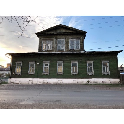 П-образный в плане, центральная часть симметричная, разделена пополам вертикальной стяжкой сруба, в шесть осей оконных проемов по второму этажу и четыре больших оконных проема по первому этажу.