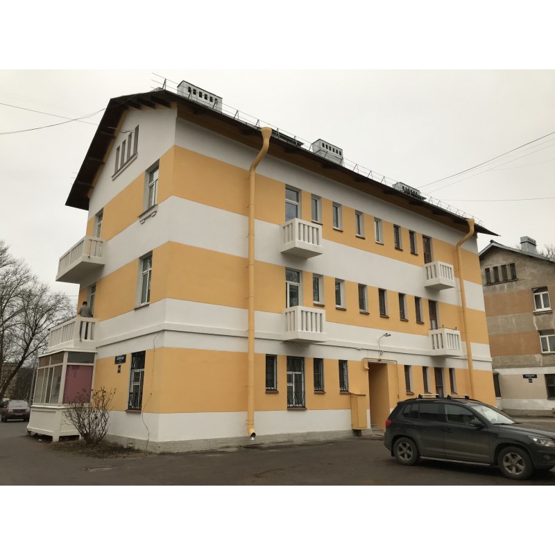 габариты и конфигурация крыши (двускатная); высотные отметки конька и карнизных свесов. Конструктивная система: наружные и внутренние кирпичные стены-местоположение; исторические отметки междуэтажных перекрытий; свес крыши на деревянных кобылках; лестничная клетка: местоположение, габариты. тип (двухмаршевая), материал ступеней (известняк), конструкция (по металлическим косоурам), металлическое ограждение на квадратных стойках, соединенных полосами (прокат). Объемно-планировочное решение: объемно-планировочное решение в габаритах капитальных стен. Архитектурно -художественное решение фасадов: архитектурно-художественное решение фасадов здания в стиле конструктивизм; материал и характер отделки фасадов: гладкая штукатурка, историческое колористическое решение; материал и характер отделки цоколя: известняковая скоба; балконы (местоположение, габариты, конфигурация): - угловые со скошенным углом со сплошным бетонным ограждением в виде филенок (1-й этаж); - угловые с ограждением из бетонных прямоугольных стоек (2-й. 3-й этажи); - по крайним осям дворового фасада (2 -й. 3-й этажи); - балкон со сплошным ограждением в торцовом фасаде (1-й этаж); штукатурная тяга между 1-м и 2-м этажами; проемы дверные - историческое местоположение, габариты, конфигурация (прямоугольные); проемы оконные: местоположение (лицевые и торцовые фасады, чердачные), габариты (разновеликие), конфигурация (прямоугольные); оконные заполнения: исторический рисунок расстекловки, исторический цвет; лицевой фасад на 5 оконных осей: центральная ось (лестничная клетка) акцентирована перспективным прямоугольным порталом, объединяющим дверной проем и широкое двойное окно над ним; оконные проемы лестничной клетки между 2-м и 3-м этажами, объединенные нишей; оконные проемы 3-го этажа с оштукатуренными подоконниками на прямоугольных консолях; дворовый фасад на 9 оконных осей: дверной проем по 5-й оси; торцевые фасады на 2 оси с завершающим шипцом с 4-мя узкими чердачными окнами.