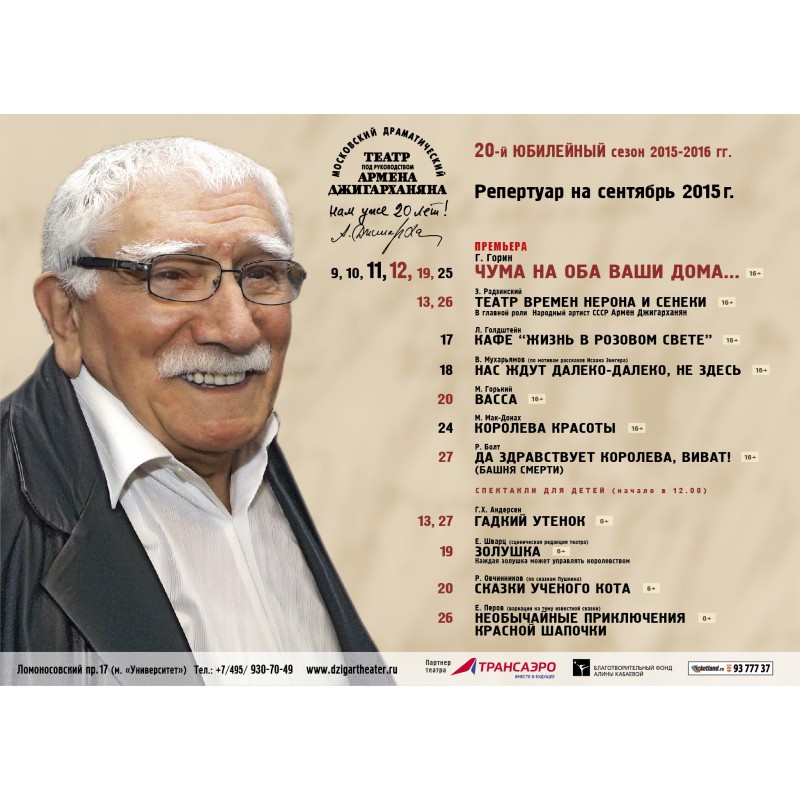 Драматический театр под руководством Армена Джигарханяна – один из театров г. Москвы. Расположен по адресу: Ломоносовский пр-т, 17. Подробную информацию о работе театра можно узнать по телефону: +7 (495) 930-03-47.